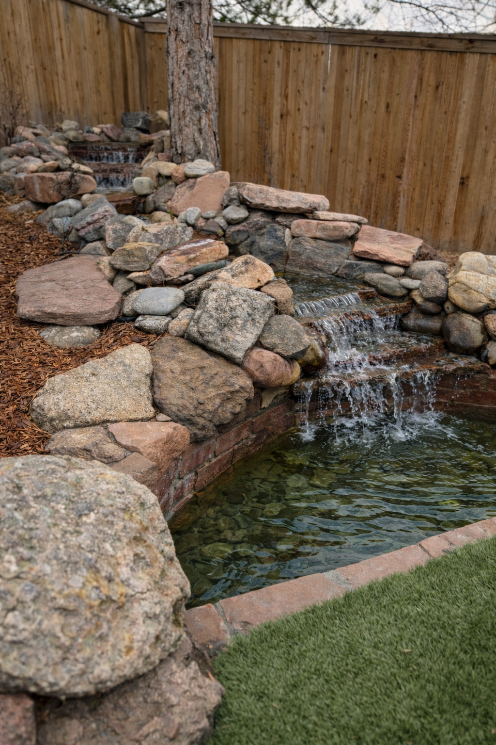 Centennial, ColoradoA custom outdoor retreat featuring beige flagstone patios, curved retaining walls, a fire feature, water element, synthetic turf lawn, and landscape lighting — designed to create a welcoming space for family gatherings.